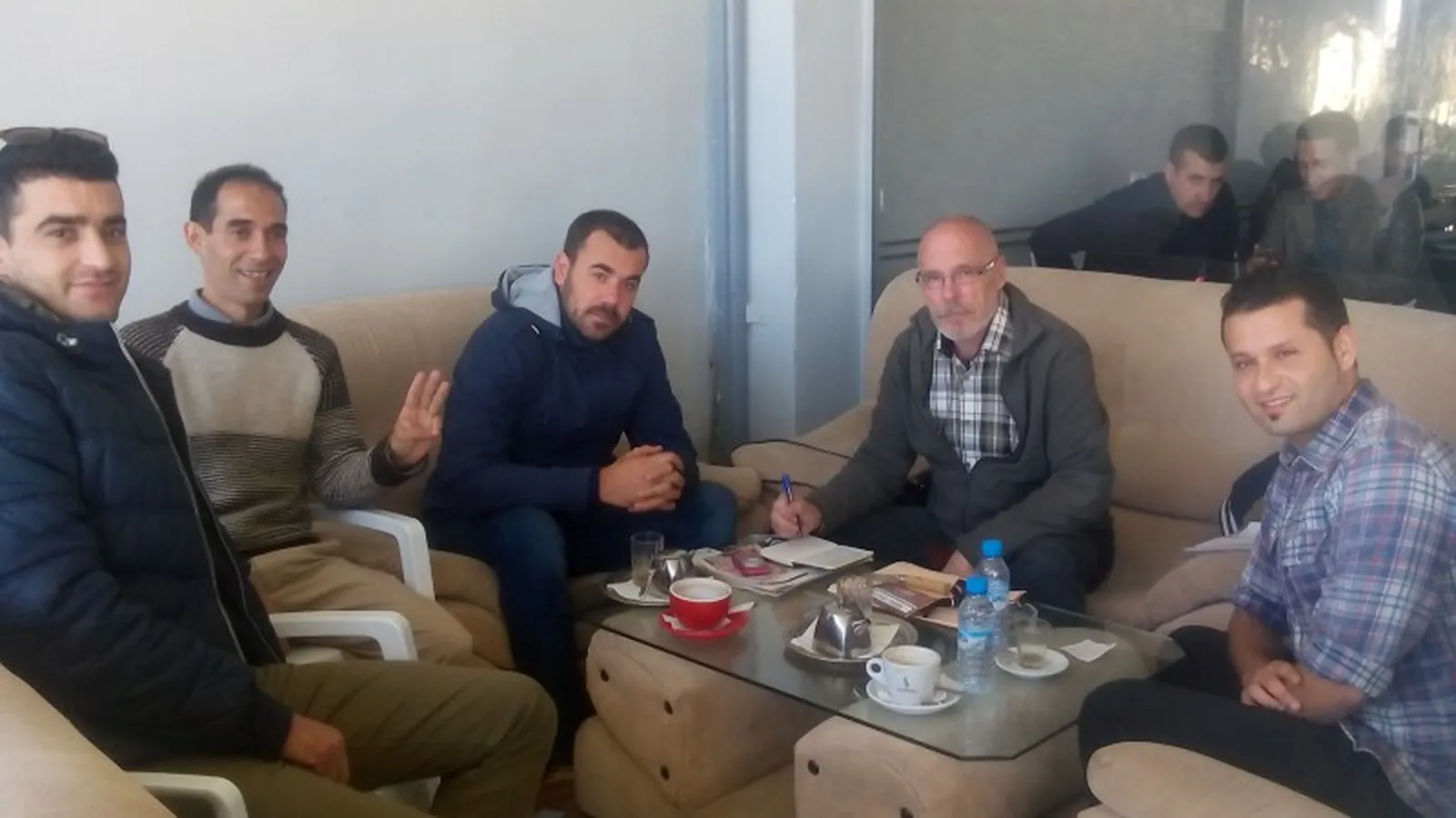 El pasado 8 de noviembre con activistas del movimiento popular de Alhucemas. Al fondo y a la izquierda, Nasser Zafzafi, líder de los indignados rifeños. A la derecha el portavoz del movimiento, Reda Benzaza, profesor en el Colegio Español Gaspar Melchor de Jovellanos, de Alhucemas/ FOTO: Archivodel Autor