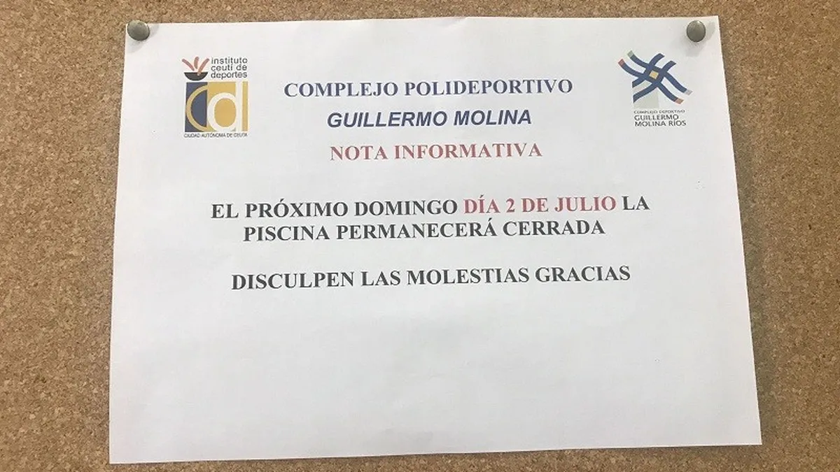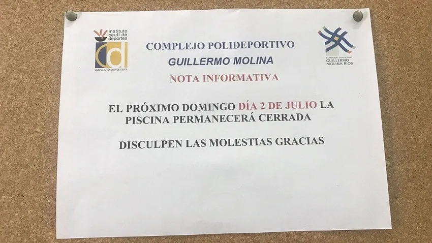 Este domingo, 2 de julio, la piscina del Guillermo Molina permanecerá cerrada y asi lo anuncia el Instituto Ceutí de Deportes (ICD) a través de un cartel en el tablón de anuncios del complejo deportivo desde la mañana de este viernes. Lo que no se señala es que si la piscina no abre es porque no habrá quien controle el acceso a la misma, ya que el contrato para este servicio finaliza este sábado y la adjudicataria del mismo, Arasti Barca, no está dispuesta a seguir prestándolo si la Ciudad Autónoma no se lo pide por escrito.