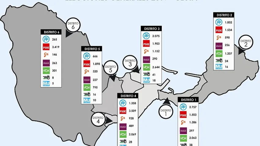 Sin rival en el espectro del a izquierda, la candidatura encabezada por José Simón en la ciudad cosechaba este domingo 13.766 votos, frente a los 6.947 de las últimas elecciones generales. La mayoría de ellos llegados desde el distrito 6 y el 4. En ambas zonas los socialistas obtuvieron más de 3.000 votos, aunque no sólo ganaron en estas áreas, ya que el PSOE también se impuso en el distrito 2 y en el 5. Así, los socialistas barrieron desde el Recinto hasta el Hacho y desde Hadú hasta el Príncipe y Benzú. Mientras, en el centro la contienda se libró entre PP y Vox.