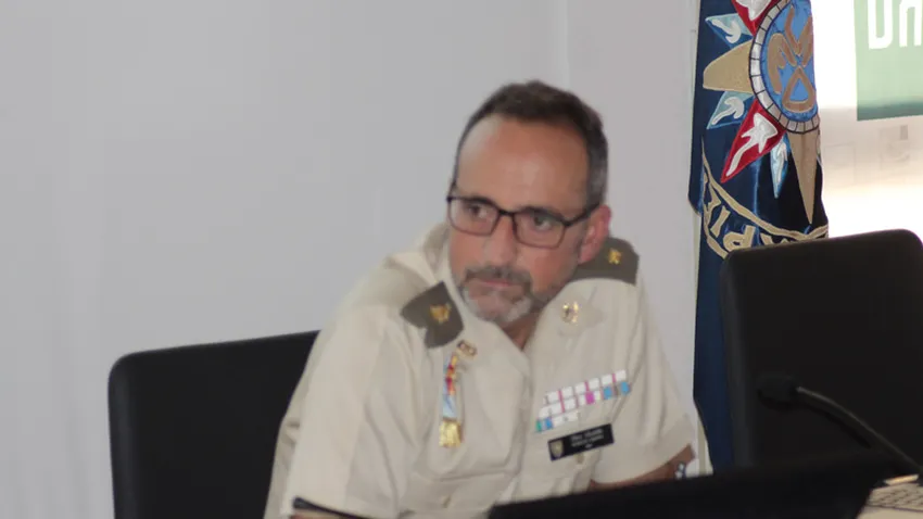 El Teniente Coronel del Ejército de Tierra, Jesús Díez Alcalde, analista a su vez del Instituto de estudios Estratégicos cuenta con una sobrada experiencia sobre el terreno ya que fue Oficial de Cooperación Cívico-Militar de la Misión de Naciones Unidas para Eritrea y Etiopía en 2003, y más recientemente, Oficial de Información Pública de Naciones Unidas y de España en el Sector Este de la Operación UNIFIL en 2011. Durante su alocución, “Operaciones y misiones militares de la Unión Europea: compromiso con la paz y seguridad internacionales” desgranó sus conocimientos al respecto centrándose en la evolución de la Política Común de Seguridad y Defensa de la UE, fruto de su experiencia activa en estas misiones.