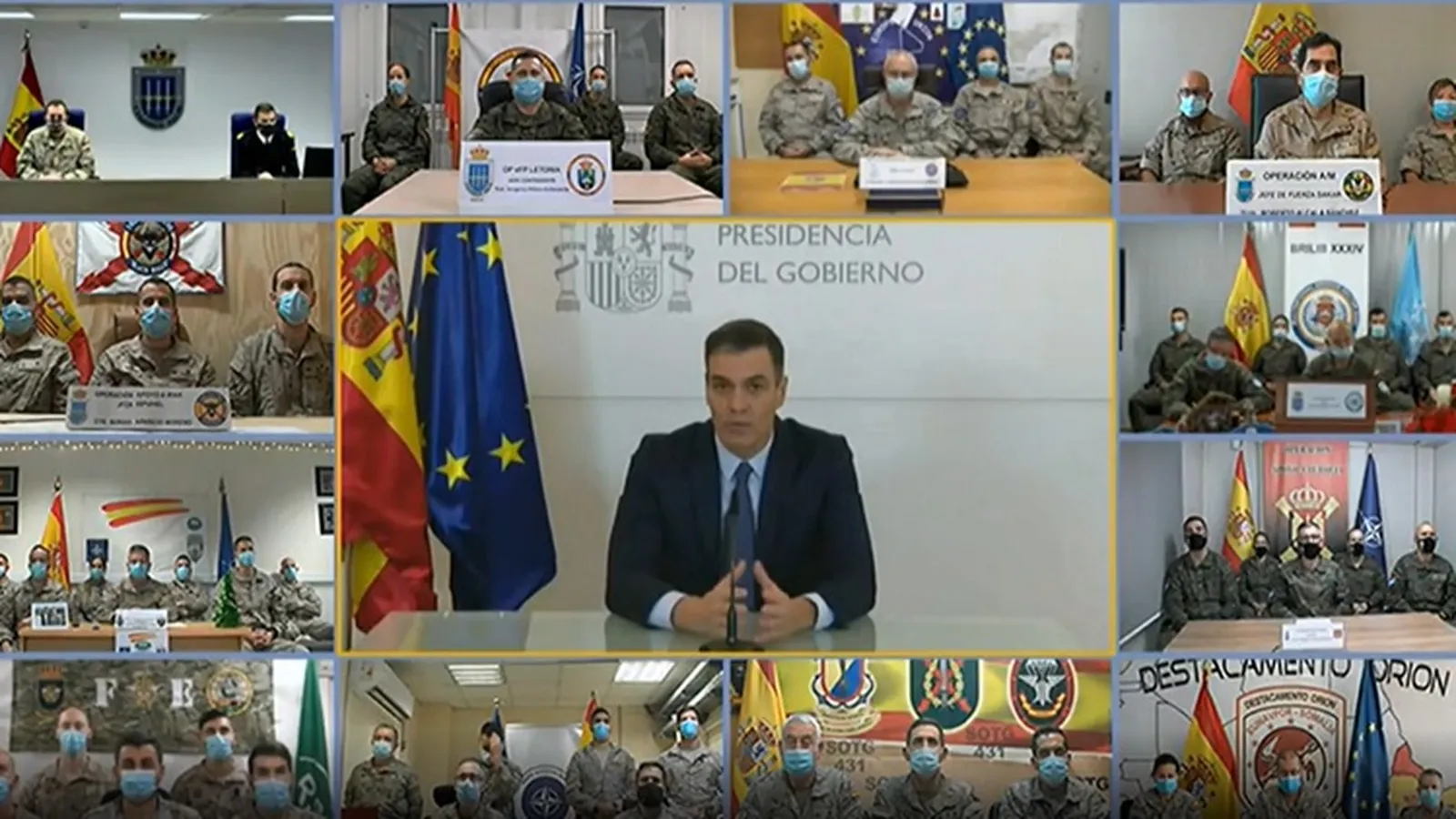 "Cuidaros y protegeros", les ha indicado Pedro Sánchez en su mensaje a las tropas que en esta ocasión ha tenido que ser grabado debido a la cuarentena que esta cumpliendo el presidente del Gobierno tras haber dado positivo su homólogo francés Emmanuel Macron. En el acto a las tropas estuvieron presentes la ministra de Defensa, Margarita Robles, y el JEMAD, general Miguel Ángel Villaroya.