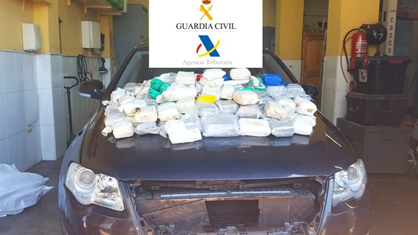 Por un lado, se produjo la detención de M.E.G., nacido en 1984, en Marruecos, y con permiso de residencia y trabajo en España, al serle intervenidos 77.300 gramos de resina de hachís, valorados en 122.000 euros, ocultos en el interior de un doble fondo practicado en los faldones del vehículo e interior depósito combustible, del vehículo en que viajaba, marca Volkwagen-Passat, de matrícula alemana, cuyas placas de matrícula se encontraban falsificadas.