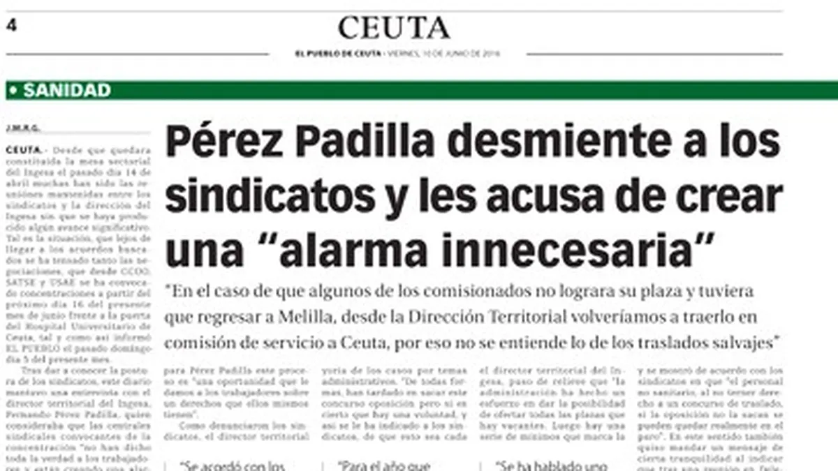 Hay que recordar que cuando la situación se encontraba más tensa, Pérez Padilla quiso “despejar ciertas dudas con el fin de tranquilizar a la plantilla del Ingesa” y durante una entrevista concedida a EL PUEBLO quiso dejar claro que “el concurso de traslado se hace sólo entre propietarios de plazas, por lo que en esos concursos nadie va a perder su empleo. No hay que olvidar que es un derecho de los trabajadores y como tal la Administración tiene la obligación de satisfacer ese derecho, aunque no se haga a veces con la continuidad que nos gustaría, pero se hace”.