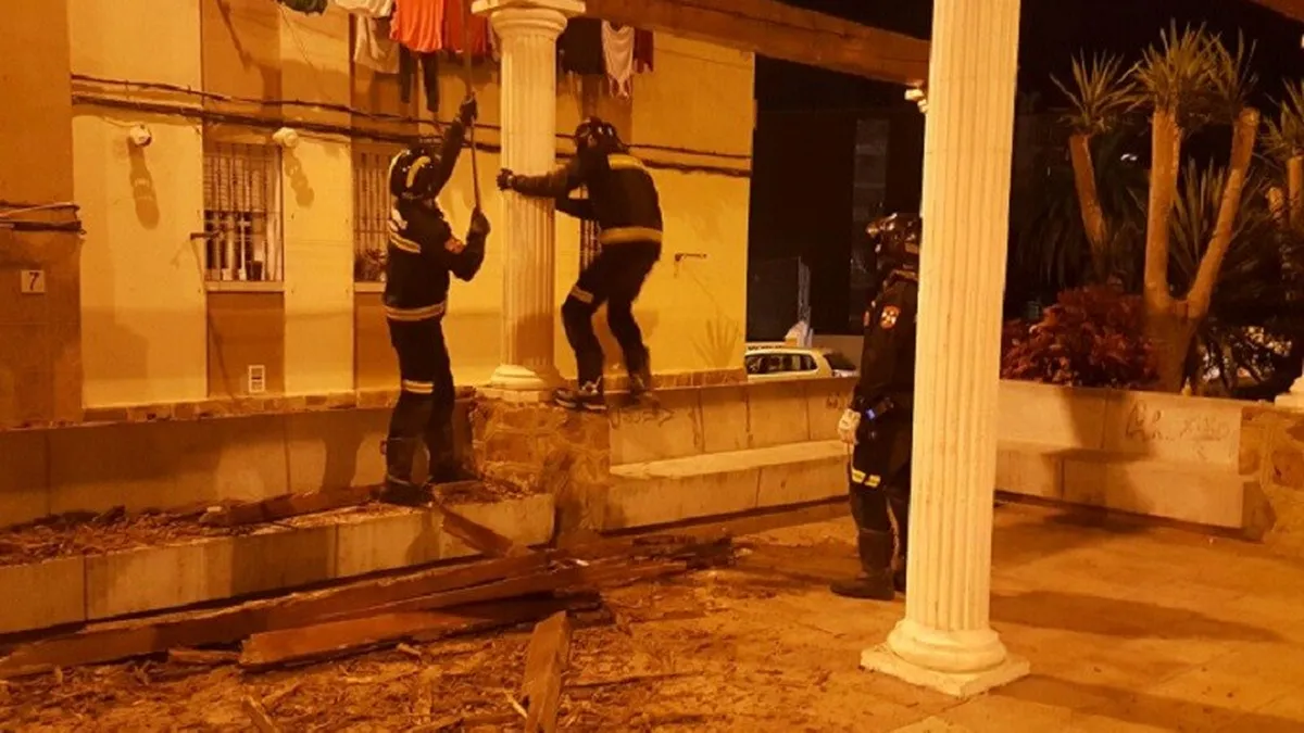 En ese mismo instante y ante la peligrosidad de la situación se dio aviso al Servicio de Extinción de Incendios y Salvamento que desplazó hasta la barriada una dotación que terminó por derribar los trozos de viga que se quedaron colgando.