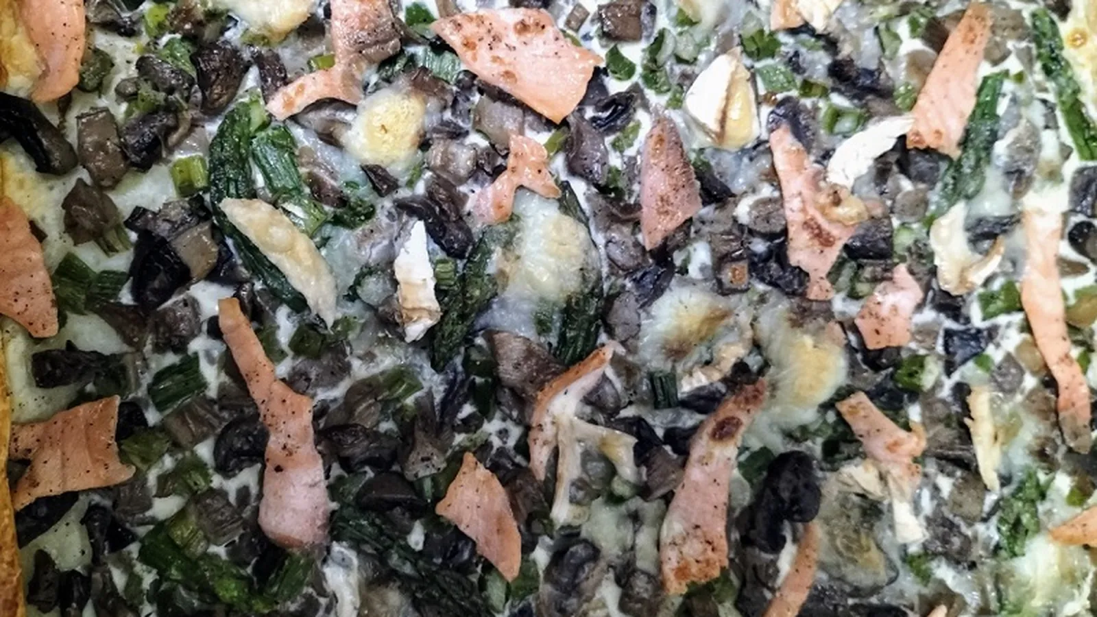 3. Rellenar el pastel: Extiende el salteado de espárragos y setas sobre la base de hojaldre. Mezcla el huevo batido con la nata líquida y viértelo en los huecos del relleno. Trocea el queso de Mahón y corta el salmón ahumado en tiras, distribuyéndolos de manera uniforme sobre el pastel.