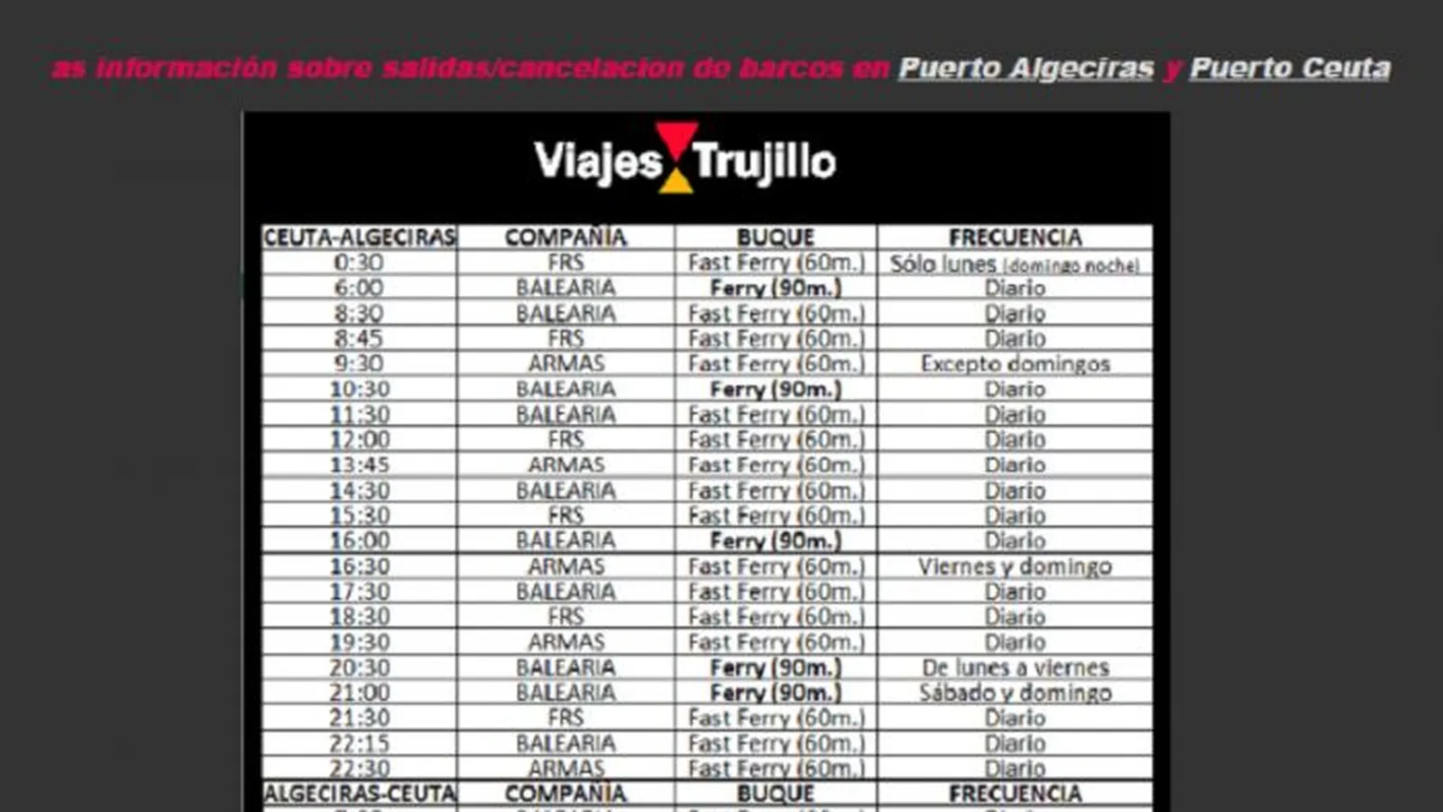 El Pueblo de Ceuta ha puesto a disposición de sus lectores los horarios de las navieras que operan en la ruta marítima entre Ceuta y Algeciras.