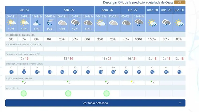 Ya de cara al sábado, 25 de enero, las previsiones muestran máximas de 19 grados con mínimas de 13. Además, se prevé una jornada de cielos nubosos y probabilidad de lluvia del 55% desde las 12:00 horas