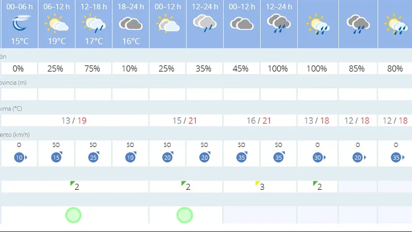 Por otra parte, en lo que se refiere a las temperaturas, la Agencia Estatal de Meteorología apunta que las máximas podrían llegar a los 19 grados, con mínimas de 13. Sin embargo, la sensación térmica máxima podría llegar a los 20 grados, además de una humedad relativa máxima del 90%.
