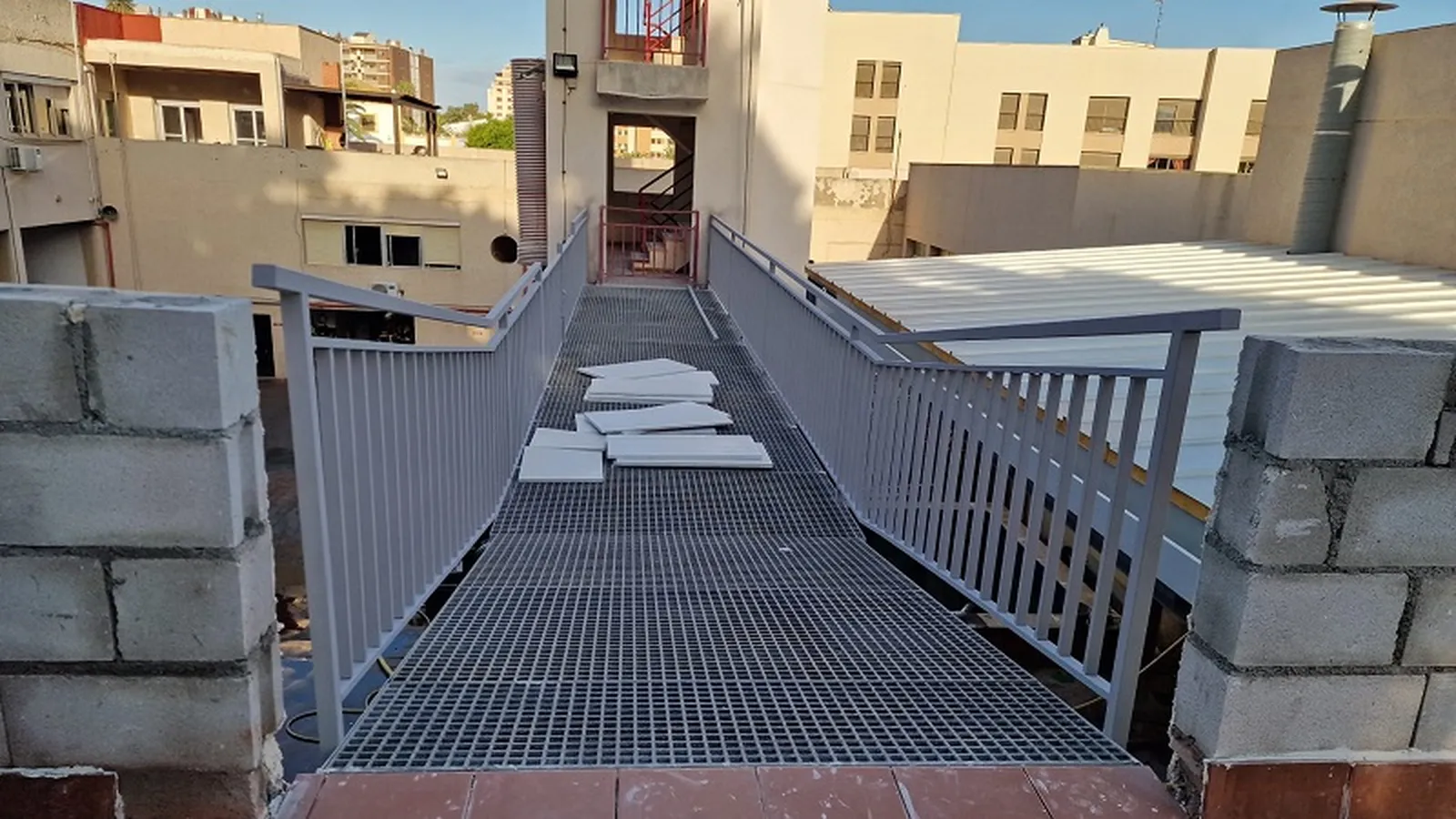 En relación a la pasarela de evacuación/comunicación entre torre de maniobras y la cubierta de la planta segunda, se realizará mediante una pasarela metálica con la ligera pendiente resultante por la diferencia de cotas existente, permitiéndose una estructura auxiliar de dos pórticos en los extremos de las vigas con cimentación independiente, diseñada en función del estudio geotécnico que se realice y de la cimentación del edificio. La pasarela deberá soportar una carga tal que permita entrenamientos de escalada, y deberá contar con barandilla metálica de protección.