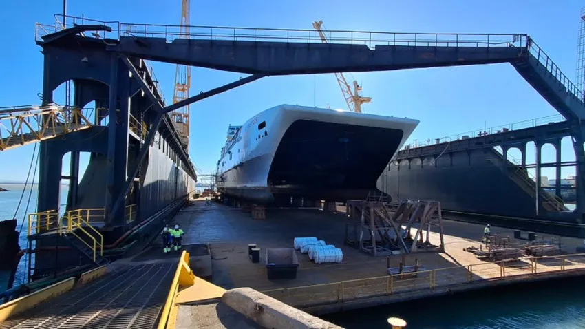 El fast ferry 'Avemar Dos' en dique seco para mantenimiento en el astillero de Cádiz