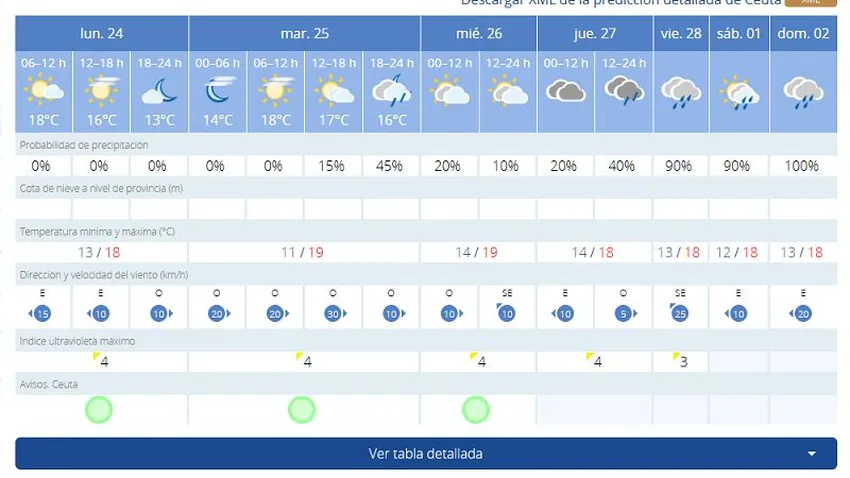 Ya de cara al martes, 25 de febrero, las previsiones muestran máximas de 19 grados con mínimas de 11. Sin embargo, la lluvia podría hacer acto de presencia en Ceuta desde las 18:00 horas.