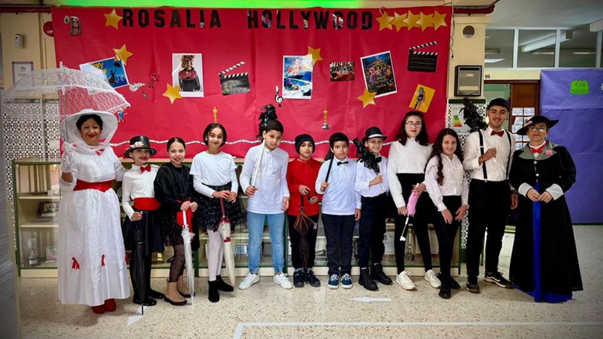 ‘Hollywood’ llegó al colegio Rosalía de Castro en pleno carnaval este jueves. En el marco de los diferentes eventos celebrados en Ceuta por estas fechas en diferentes colegios, se han realizado musicales de películas como La La Sirenita, Encanto, Mary Poppins y Grease. También se llevó a cabo un pasacalles por la barriada del centro, actividad que terminó con bailes relativos a las películas.