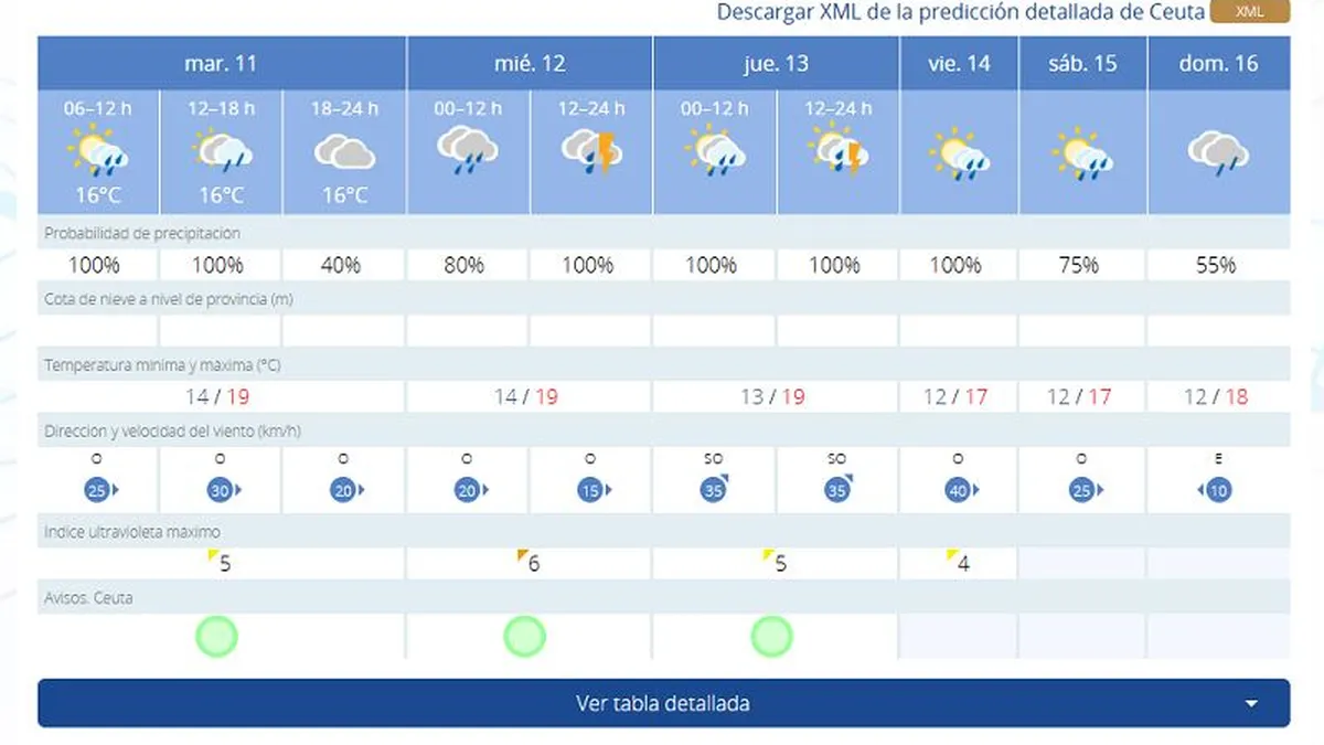 Ya de cara al miércoles, 12 de marzo, las previsiones muestran máximas de 19 grados con mínimas de 14. Sin embargo, la lluvia podría hacer acto de presencia en Ceuta, con probabilidades del 80% y 100%.