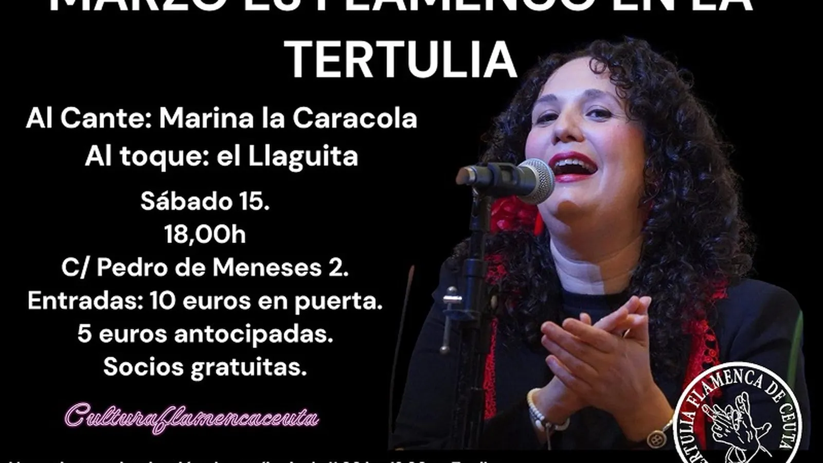 La Tertulia Flamenca de Ceuta ha organizado varios espectáculos musicales durante este mes en una serie titulada ‘Marzo es flamenco en La Tertulia’ y que tiene como invitados este sábado a la cantaora Marina La Caracola y al guitarrista José Carlos ‘El Llaguita’. La actuación tendrá lugar el próximo 15 de marzo a las 18:00 de la tarde en su local de la céntrica calle Pedro de Meneses número 2.