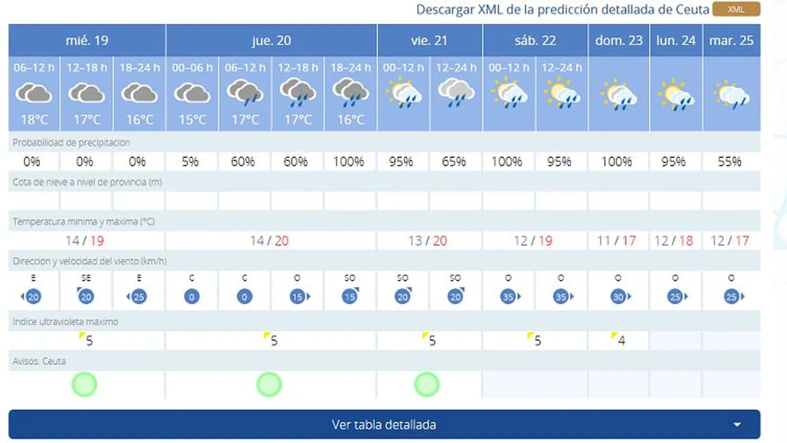 Ya de cara al jueves, 20 de marzo, las previsiones muestran máximas de 20 grados con mínimas de 14. Además, AEMET prevé lluvias con probabilidades de entre el 60% y el 100%, dependiendo del punto horario.