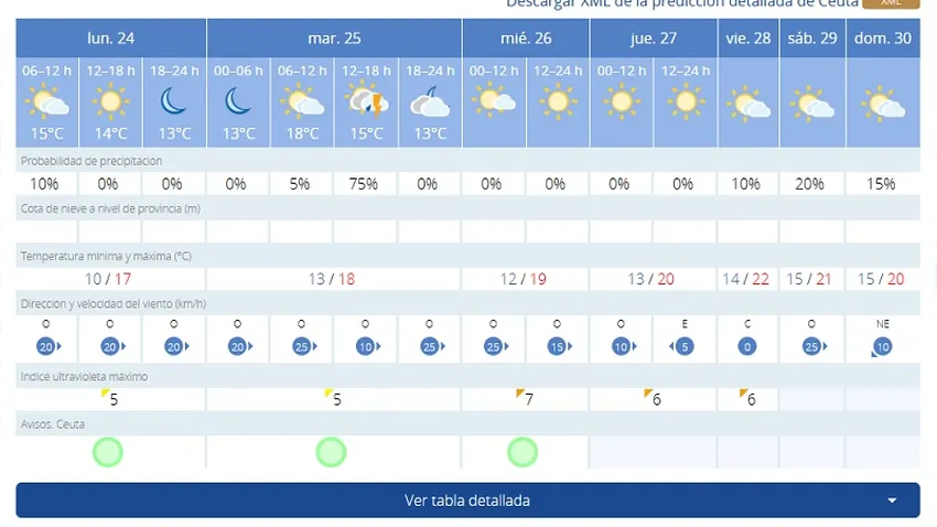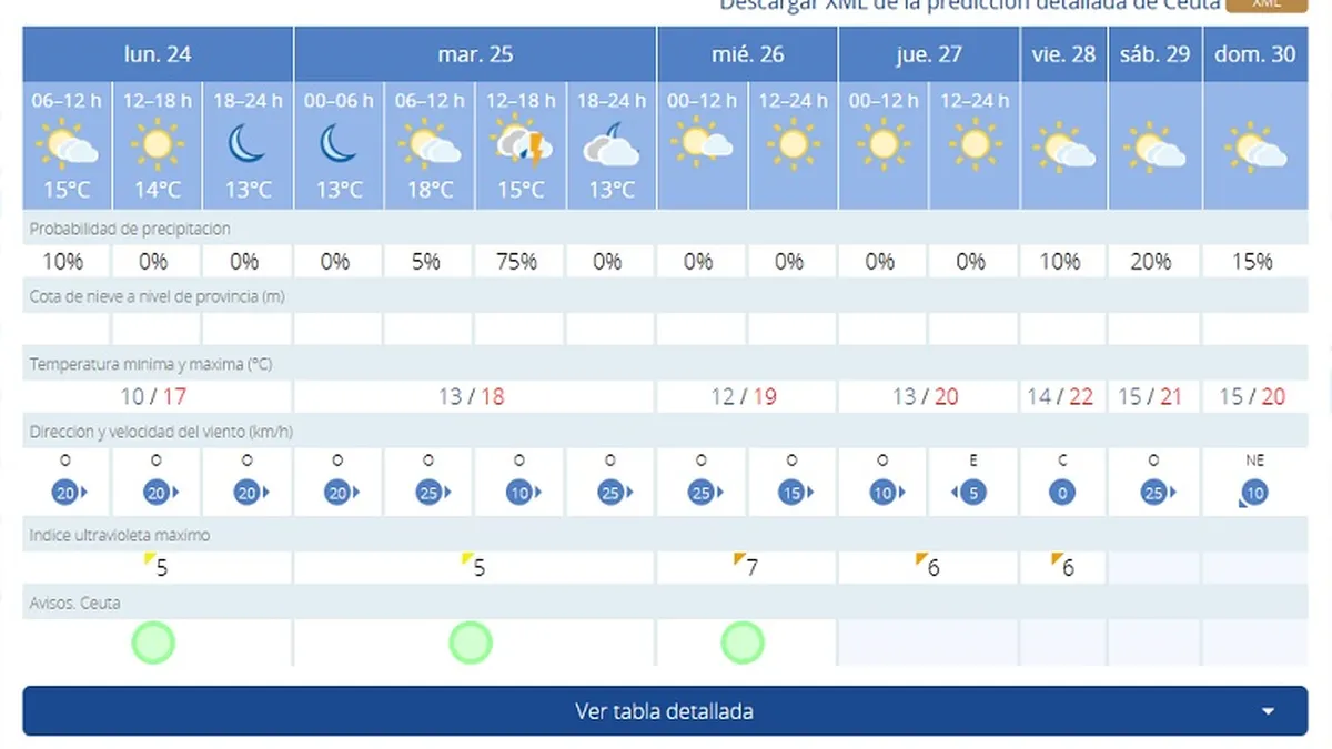 Ya de cara al martes, 25 de marzo, las previsiones muestran máximas de 18 grados con mínimas de 13. Además, AEMET prevé una jornada soleada, con intervalos nubosos y posibilidad de tormentas entre las 12:00 y las 18:00 horas