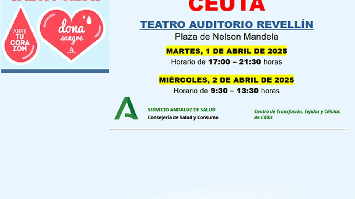 El Centro de Transfusión, Tejidos y Células de Cádiz ha convocado una nueva campaña de recogida de sangre en Ceuta para la próxima semana. Las donaciones podrán hacerse el martes 1 y el miércoles 2 en el Teatro Auditorio Revellín. El equipo sanitario atenderá a los donantes en horario de 17.00 a 21.30 horas el martes y de 9.30 a 13.30 el miércoles.