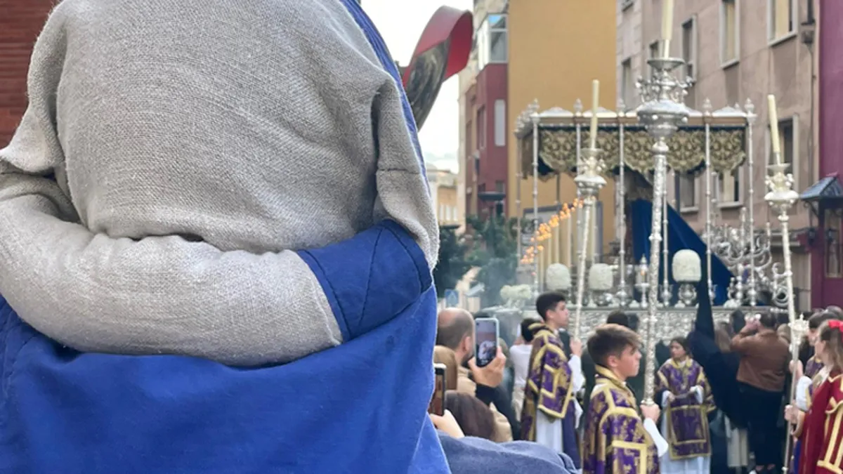 A las 19:10 de la tarde del Jueves Santo un nazareno ataviado con túnica azul oscuro y cíngulo a juego llamaba a las puertas de la Iglesia de San Francisco que dan a la Calle Cervantes. La parroquia se abría mientras que un agente de la Policía Nacional informaba por su pinganillo tocando su oído derecho: “Se procede a la salida de la Hermandad de las Penas”.
