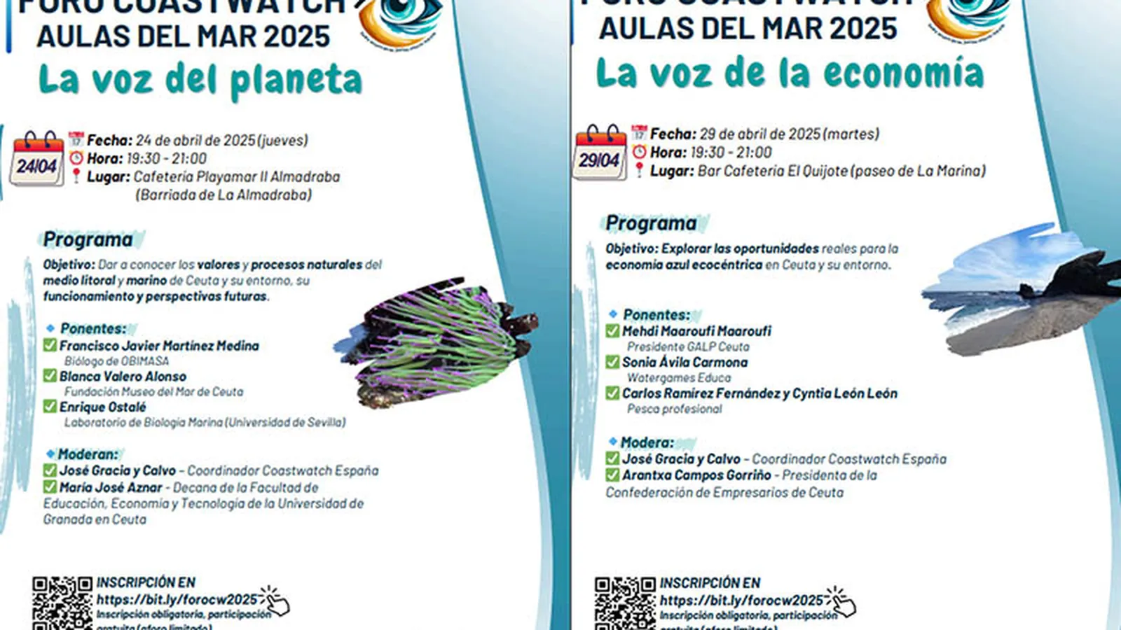La primera cita, convocada bajo el título “La voz del planeta”, se ha programado para mañana miércoles en la cafetería Playamar II de La Almadraba. El encuentro, que se desarrollará entre las 19.30 y las 21.00 horas, versará sobre el valor y los procesos naturales del medio litoral y marino de Ceuta y sus perspectivas futuras.