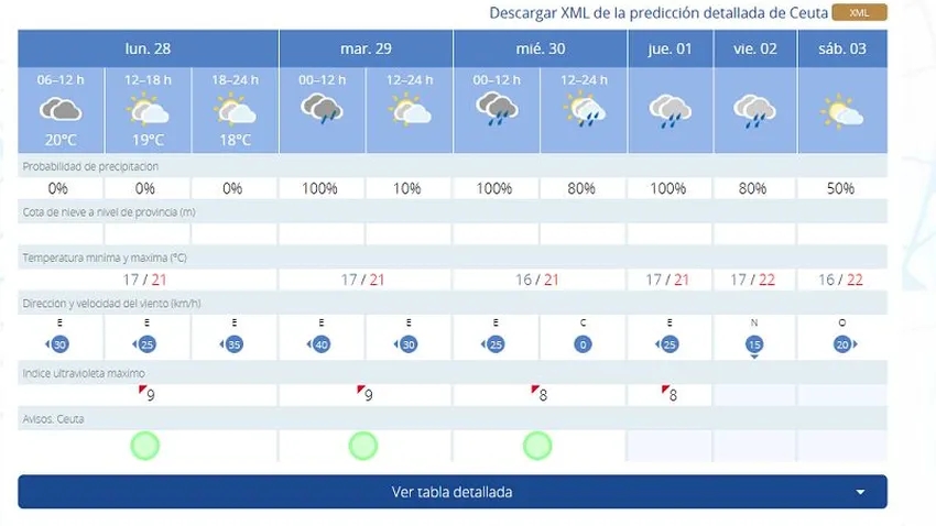 Ya de cara al martes, 29 de abril, las previsiones muestran máximas de 21 grados con mínimas de 17. Además, AEMET prevé lluvias al 100% hasta las 12:00 horas.