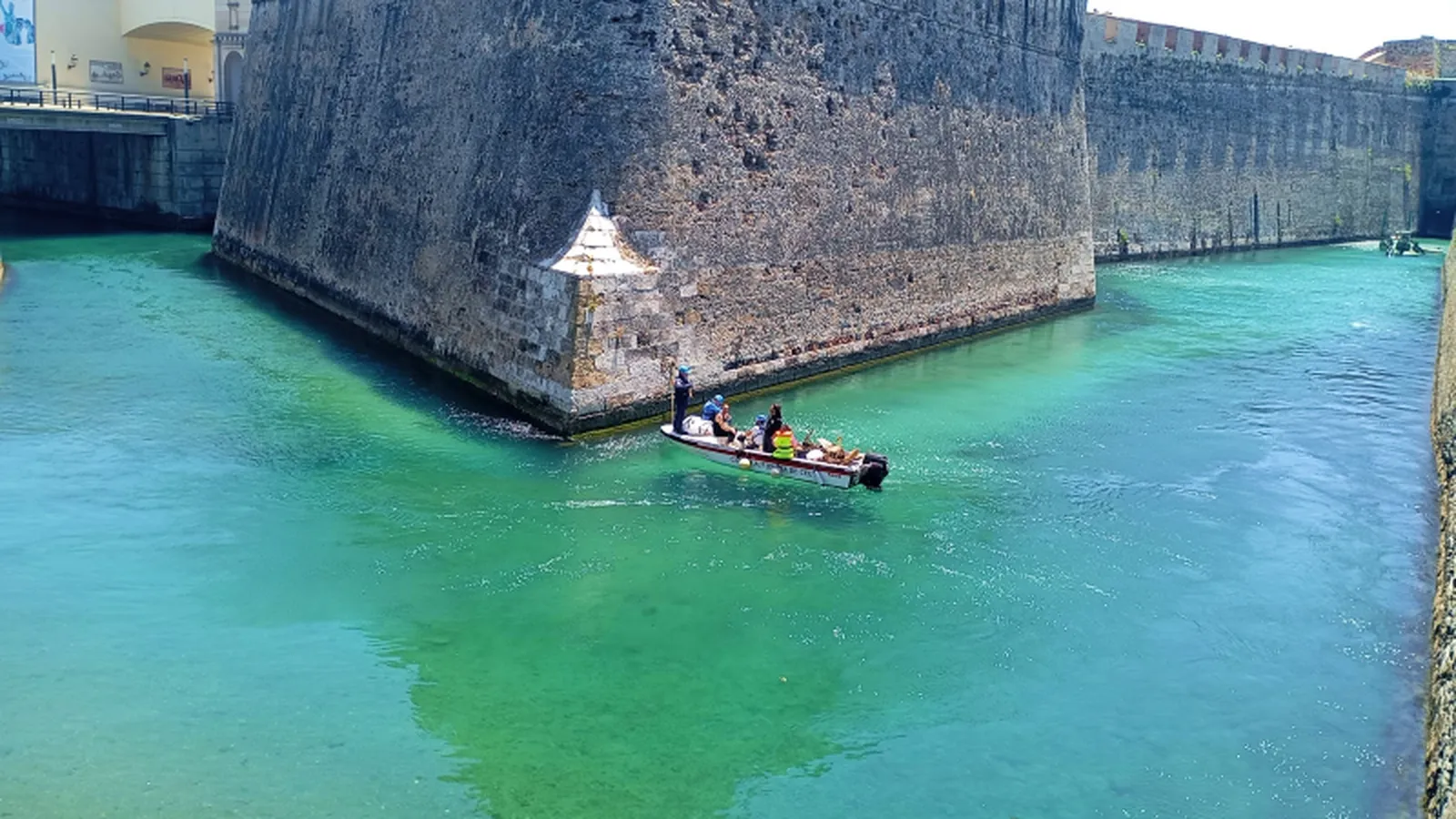 Cuando el catalán David Meca realizó en 2006 el doble cruce del Estrecho dejó algunos detalles que le habían llamado la atención. Uno de ellos era el fondo blanco del foso de las Murallas Reales. No le faltaba razón: parte del foso tiene, en su fondo, losas blancas. Es uno más de los encantos de uno de los pocos lugares del mundo en que se puede navegar en un foso sobre agua de mar.