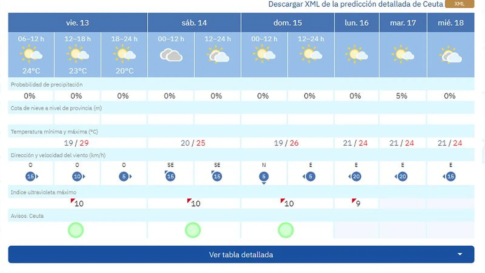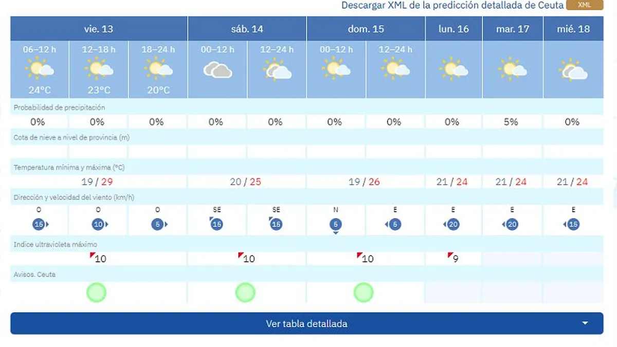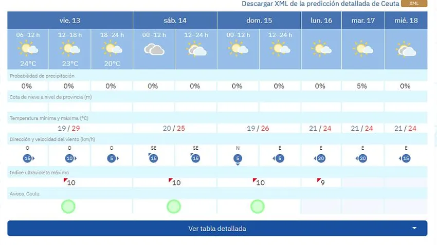 Ya de cara al sábado, 14 de junio, las previsiones muestran máximas de 25 grados con mínimas de 20. Además, AEMET prevé cielos nubosos y posibilidad de intervalos soleados a partir de las 12:00 horas