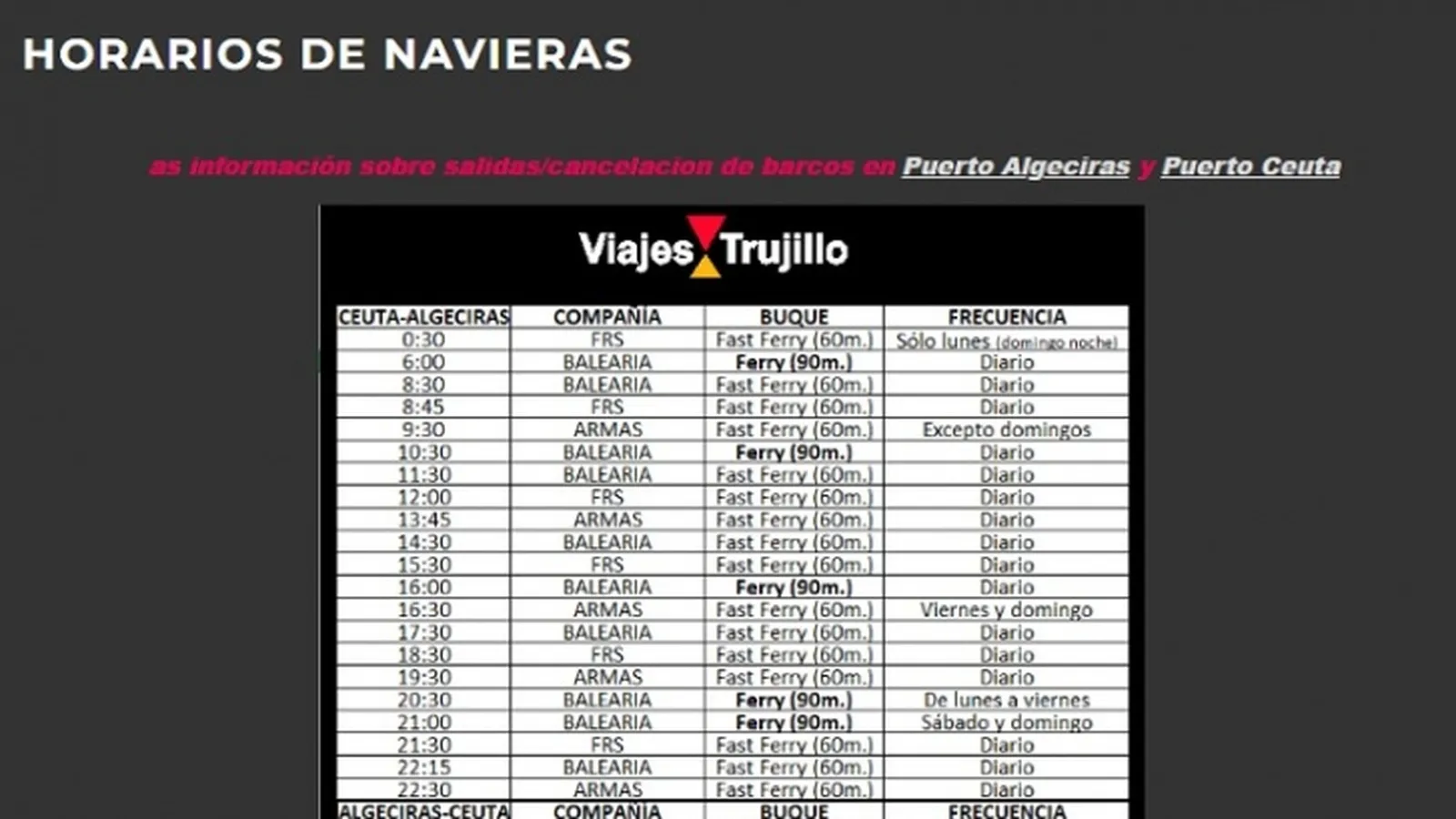 El Pueblo de Ceuta ha puesto a disposición de sus lectores los horarios de las navieras que operan en la ruta marítima entre Ceuta y Algeciras.