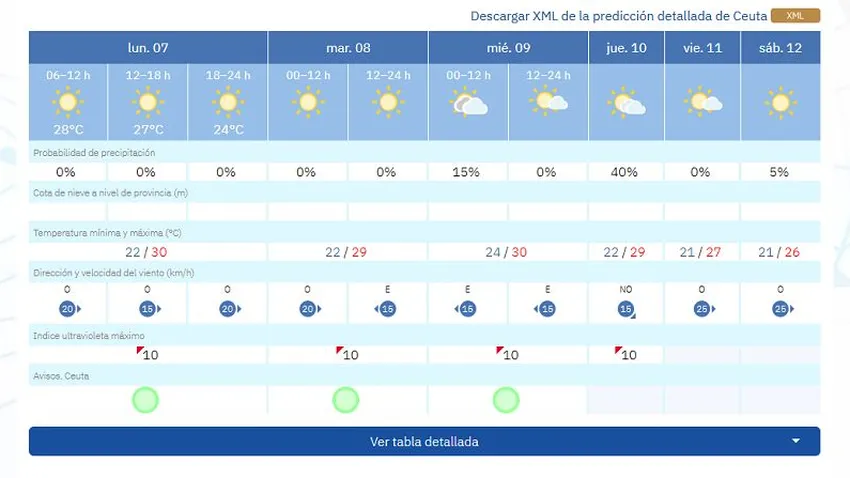 Ya de cara al martes, 8 de julio, las previsiones muestran máximas de 29 grados con mínimas de 22. Además, AEMET prevé cielos soleados.