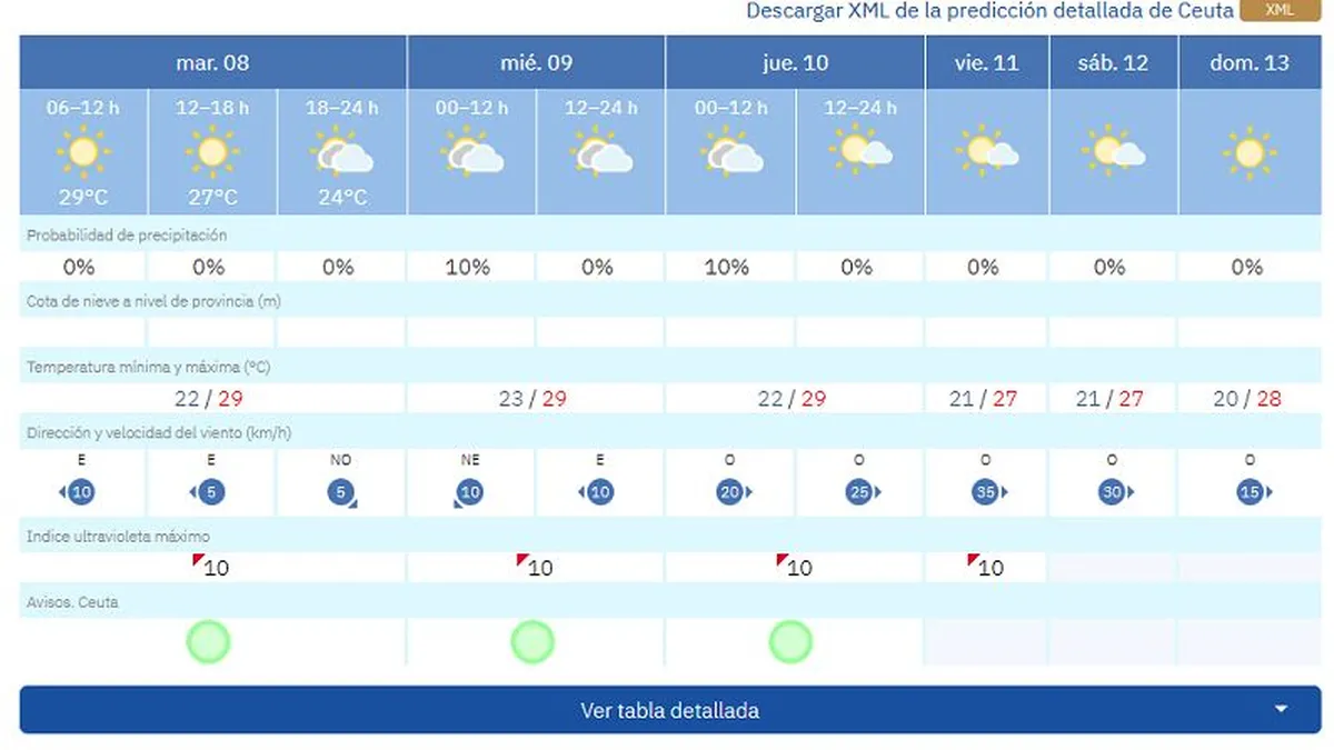 Máximas de 29 grados para este martes en Ceuta con cielos soleados y humedad al 90%