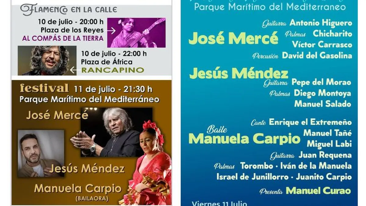 Esta noche de viernes será la segunda y última del Festival Flamenco de Ceuta 2025, y en ella se espera en el escenario del Parque Marítimo del Mediterráneo a los cantaores jerezanos José Mercé y Jesús Méndez, así como a su paisana bailaora Manuela Carpio. La gala será presentada por Manuel Curao y dará comienzo desde las nueve y media de la noche.
