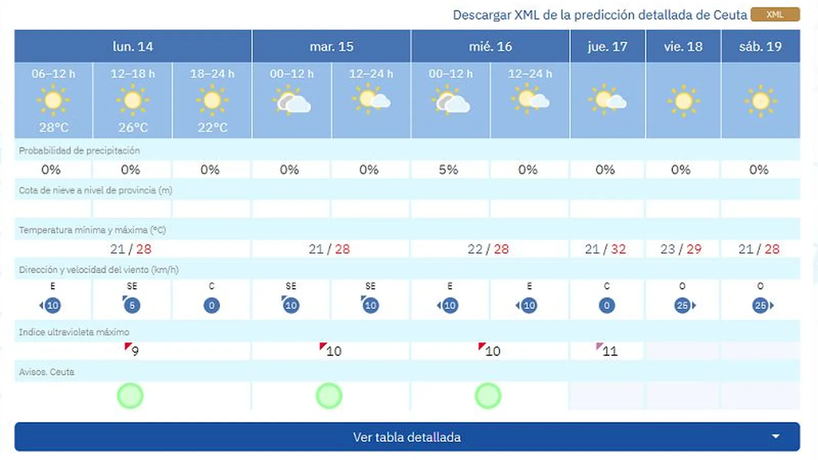 Ya de cara al martes, 15 de julio, las previsiones muestran máximas de 28 grados con mínimas de 21. Además, AEMET prevé cielos parcialmente despejados
