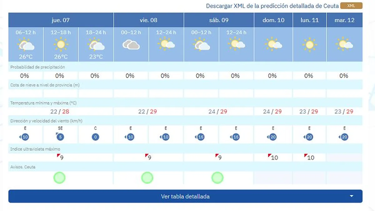 Ya de cara al viernes, 8 de agosto, las previsiones muestran máximas de 29 grados con mínimas de 22. Además, AEMET prevé cielos nubosos para buena parte de la jornada