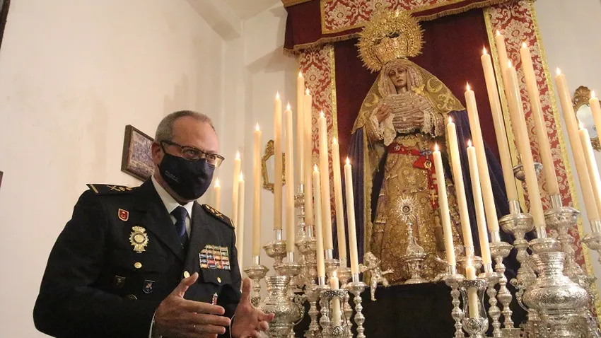 Por este motivo, este martes, el actual jefe superior del CNP, acudía hasta la Parroquia de San Juan de Dios para hacer entrega a la Virgen de la Amargura de este bastón.