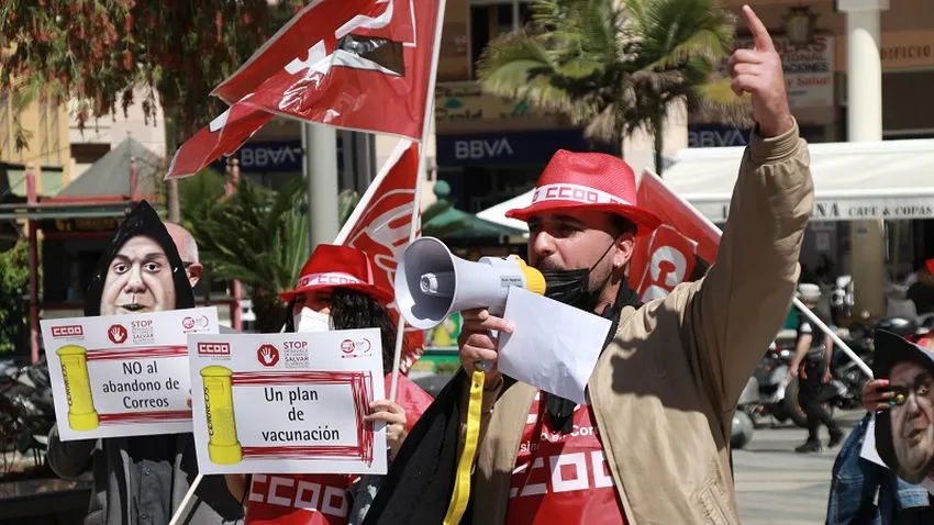 Los delegados sindicales de CCOO y UGT de Correos Ceuta se han concentrado a las 12 horas del mediodía del martes en la Plaza de los Reyes para denunciar la situación en la que se encuentran la plantilla de la empresa mixta. “El motivo es el descontento que tenemos con el presidente Serrano, que quiere privatizar Correos convirtiéndolo en un desguace”, ha manifestado la delegada del Servicio Postal de UGT, Mari Ángeles Chaves. Las organizaciones sindicales denuncian que hay una escasez de trabajadores en la plantilla y que se les está discriminando del proceso de vacunación. Además, Chaves insiste en que el presidente de Correos “lo está haciendo bastante mal” y por ello se han caracterizado en la concentración con caretas de Serrano “porque es como si fuera un vampiro”.