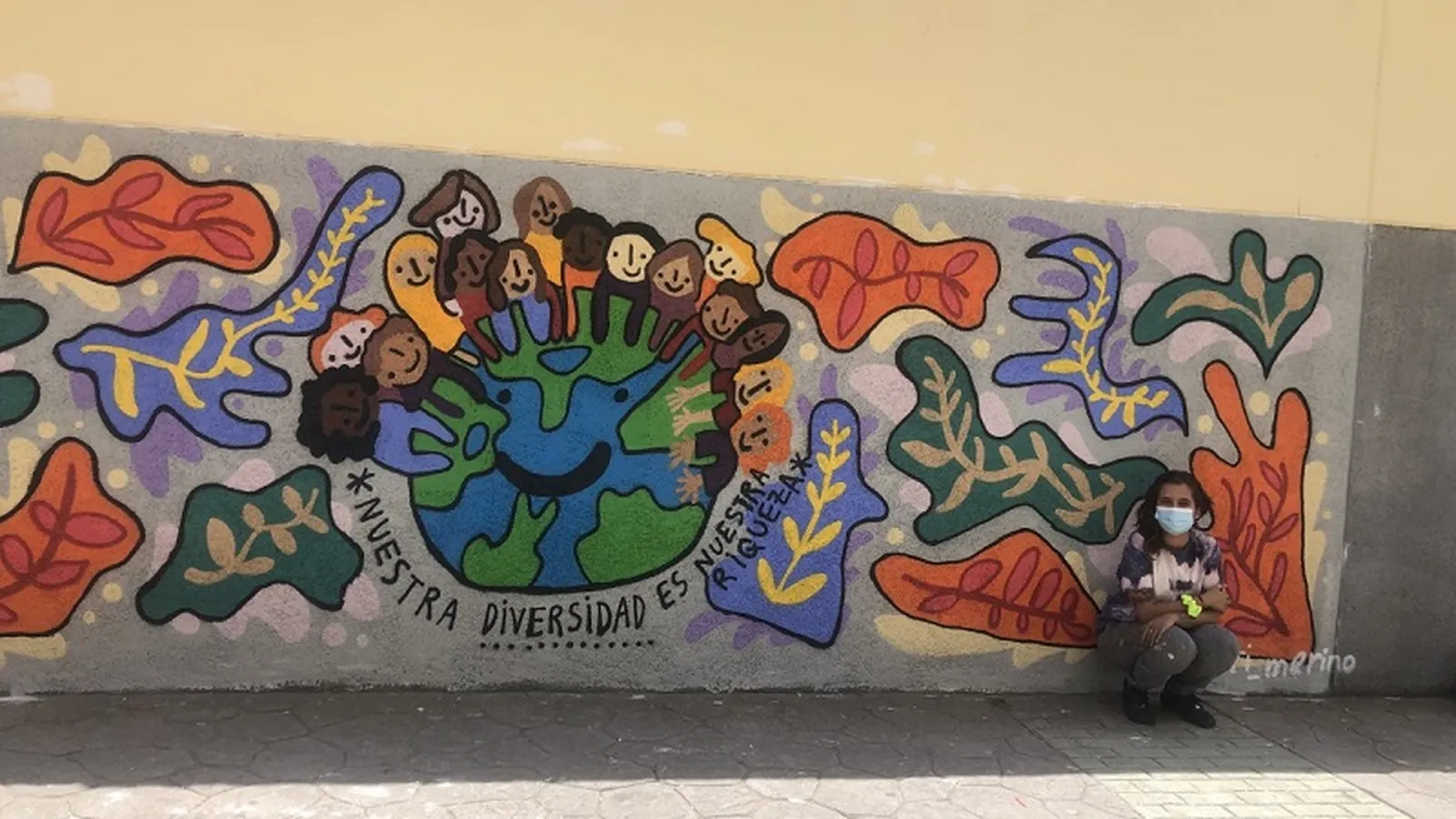 El mural está hecho en un estilo de arte naif con colores vivos y llamativos, pero no estridentes. Representa a un grupo de personas de diversos orígenes que están sentadas alrededor de una mesa que en realidad es el planeta Tierra. Su actitud amable y sonriente apela a la serenidad y a la buena convivencia entre vecinas/os. El mural incluye el siguiente lema: Nuestra diversidad es nuestra riqueza.