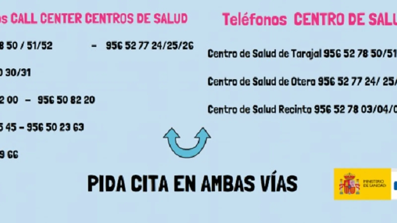 Se han habilitado nuevas líneas telefónicas para los centros de salud de Otero y del Tarajal. INGESA solicita a todos los usuarios que llamen a los teléfonos del Call Center y de su centro de salud. Pueden pedir cita previa a través de la vía telefónica en los números habilitados, a través de la página web http://www.areasanitariaceuta.es/, a la derecha de la página y a través de la app “Cita INGESA”.