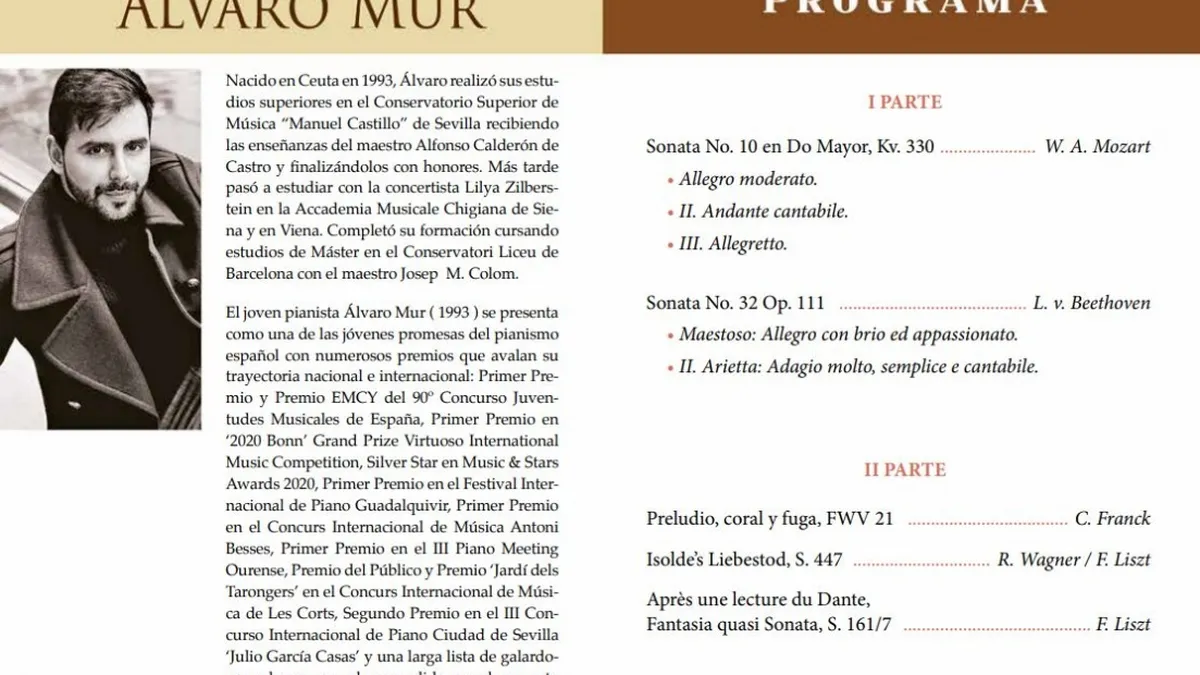 La Consejería de Educación y Cultura recuerda la disponibilidad de entradas para el recital de piano del ceutí Álvaro Mur el 12 de febrero y el concierto de clarinete y piano del grupo conformado por el almeriense y el napolitano de 'Ópera Night'.