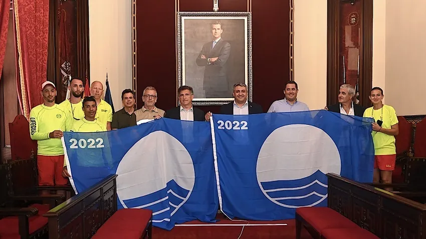 El consejero de Medio Ambiente y Servicios Urbanos, Yamal Dris, ha recibido este miércoles de manos del presidente de la Asociación de Educación Ambiental y del Consumidor (ADEAC), José Palacios, las Banderas Azules que, un año más, han obtenido las playas de La Ribera y El Chorrillo.