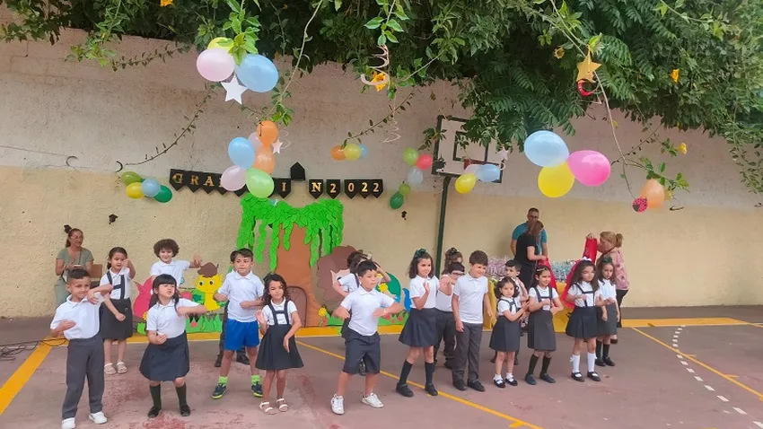 Medio de centenar de niños y niñas de entre cinco y seis años, de la clase A y B, celebraron su graduación de Educación Infantil con la imposición de bandas, regalos por parte del centro escolar de la AMPA, en una fiesta celebrada en el patio