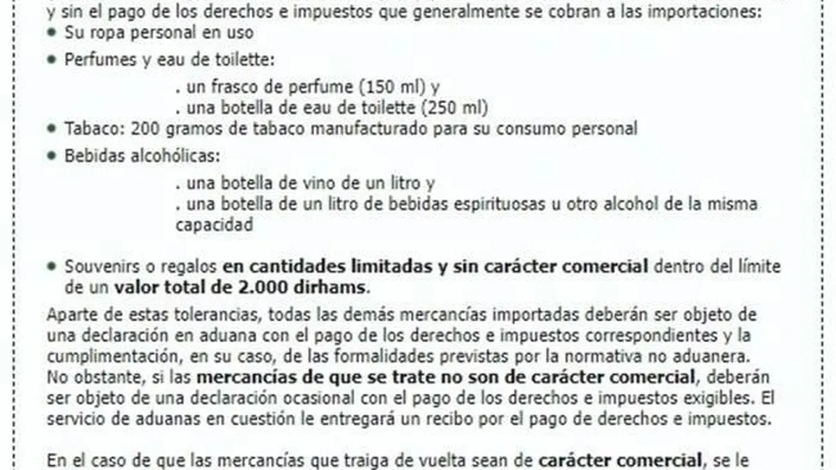 El régimen de viajeros actualmente en vigor para ciudadanos marroquíes se puede consultar en la web de la Aduana de Marruecos y establece, entre otras cosas, que un residente marroquí que regresa a Marruecos de un viaje al extranjero puede llevar consigo o en su equipaje regalos o souvenirs hasta un valor total de 2.000 dirhams sin declaraciones ni formalidades aduaneras y libres de impuestos.