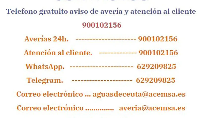 También será posible notificarla mediante las aplicaciones Whastsapp y Telegram a través del teléfono 629 20 98 25, o bien remitiendo un correo a la dirección aguasdeceuta@acemsa.es o averias@acemsa.es
