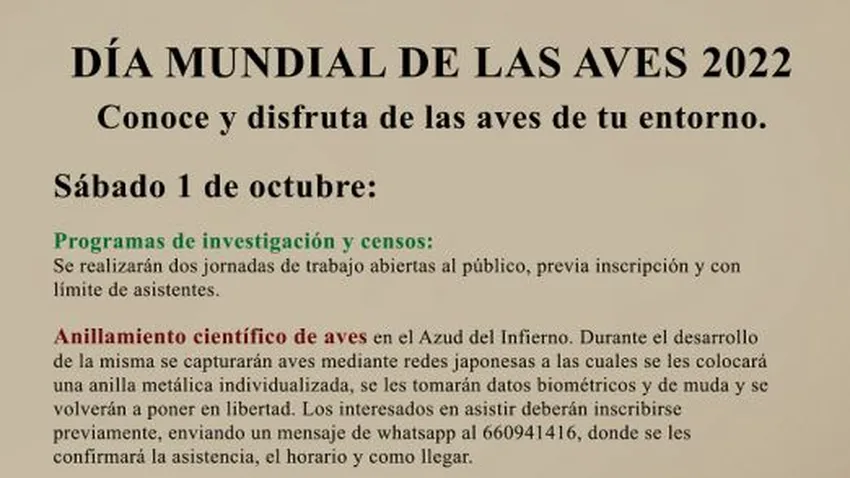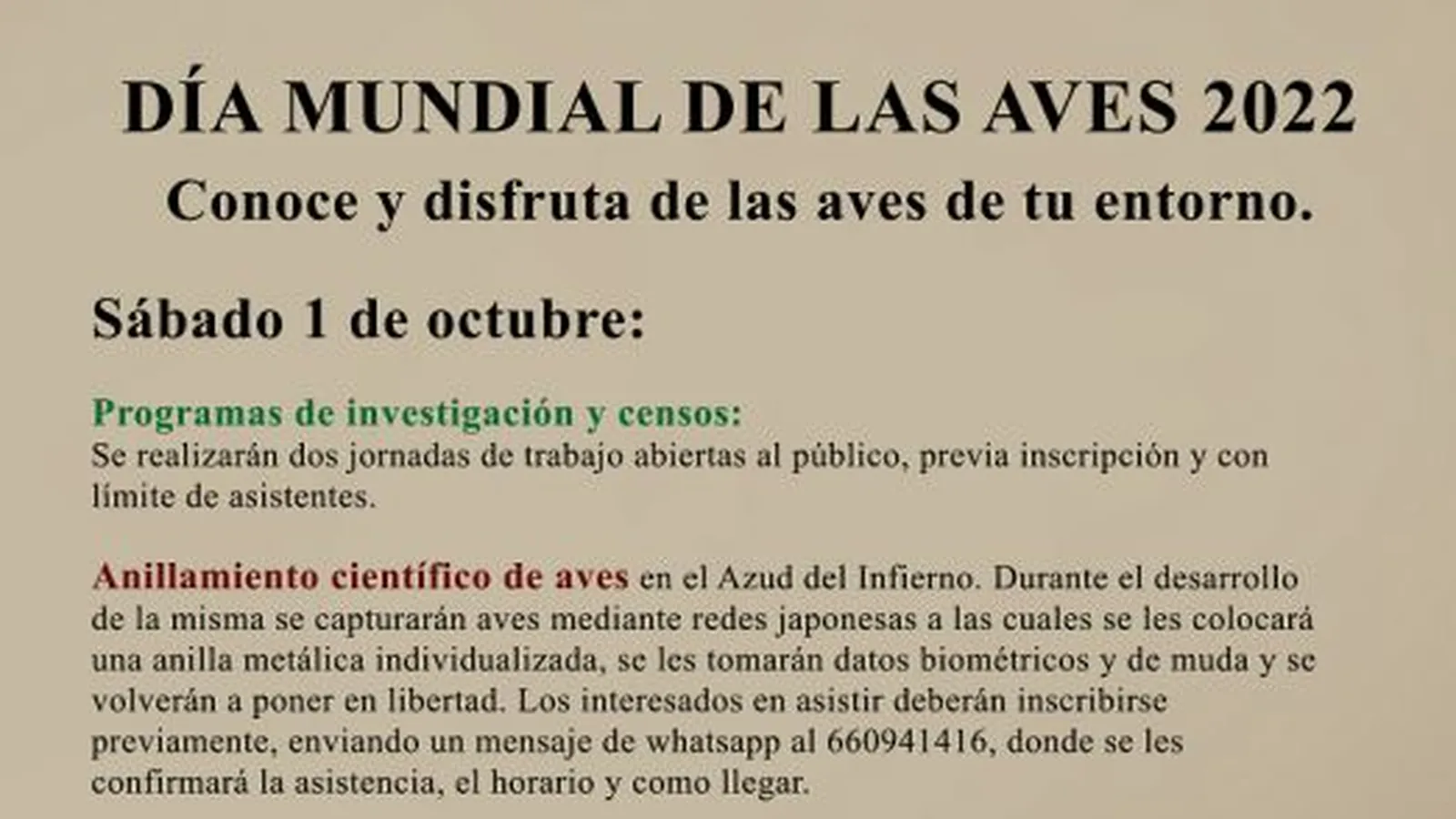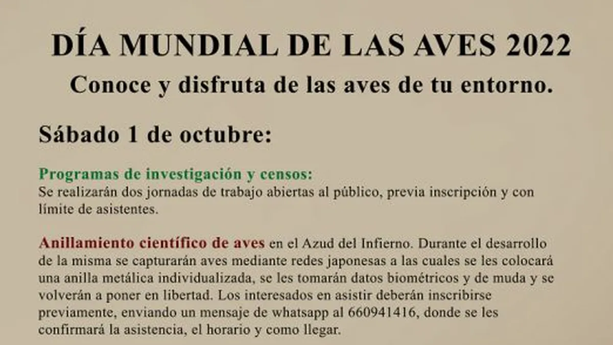El sábado 1 de octubre se realizará una jornada de anillamiento científico de aves en el Azud del Infierno. Durante el desarrollo de la misma se capturarán aves mediante redes japonesas a las cuales se les colocará una anilla metálica individualizada, se les tomarán datos biométricos y de muda y se volverán a poner en libertad. Los interesados en asistir deberán inscribirse previamente, enviando un mensaje de whatsapp al 660941416, donde se les confirmará la asistencia, el horario y como llegar.