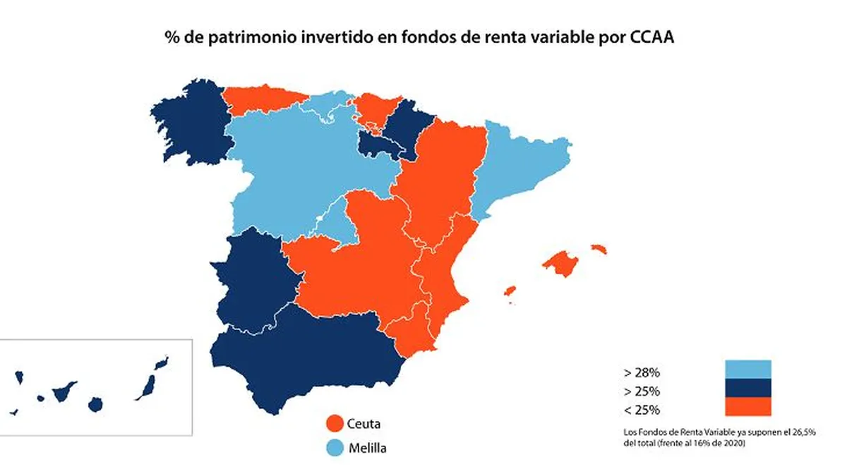 La inversión en Fondos de Renta Variable alcanzó en 2021 el 26,5% del volumen total en estos productos, registrando un aumento de más de once puntos con respecto al año anterior (16%), según el informe elaborado por el Observatorio Inverco, a partir de la información proporcionada por las Gestoras de Fondos de Inversión nacionales a cierre de 2021. La ratio Fondos de Inversión/depósitos se sitúa en Ceuta en el 20,5%, frente al 18,7% del año anterior y el patrimonio invertido en Fondos en Ceuta creció un 7,4% en 2021, hasta los 216 millones de euros.