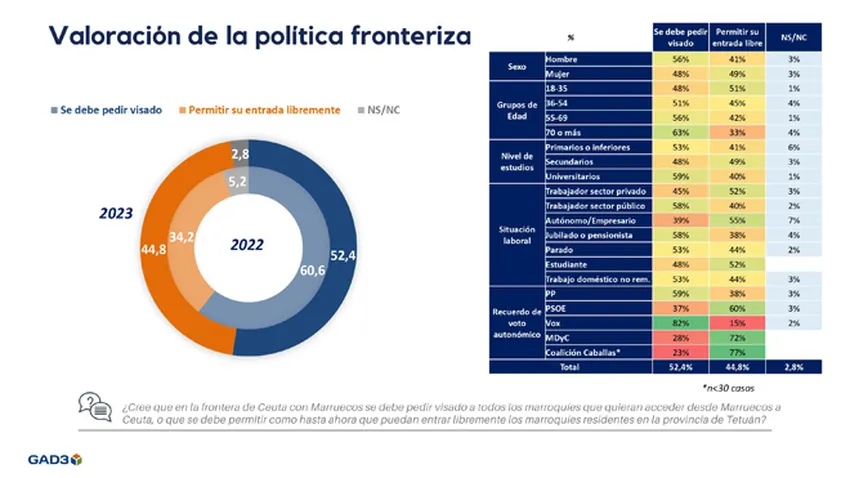 Según la encuesta socio-electoral realizada por GAD3 para EL PUEBLO, el 52,% de los ciudadanos cree que se debe mantener el visado para todos los marroquíes que quieran acceder desde Marruecos a Ceuta. Lo que se traduce en que la mayoría — por poco — prefiere mantener esta nueva situación más ordenada y de tránsito por el Tarajal.