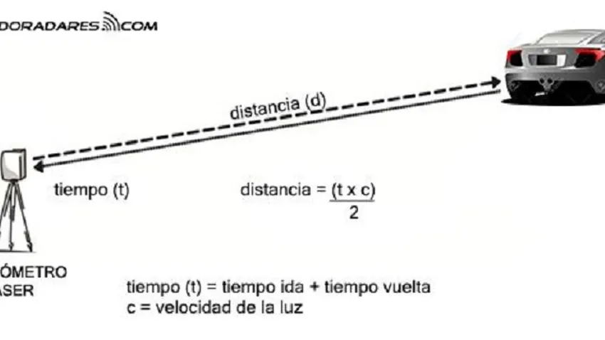 La pistola láser “dispara” unos pulsos de luz infrarroja y a la vez pone en marcha el cronómetro. Ese haz de pulsos se reflejan en nuestro coche, rebotan hacia la pistola y son captados por el sensor. En ese momento se detiene el crono. La distancia a la que nos encontremos será la mitad del tiempo transcurrido multiplicado por la velocidad de la luz.