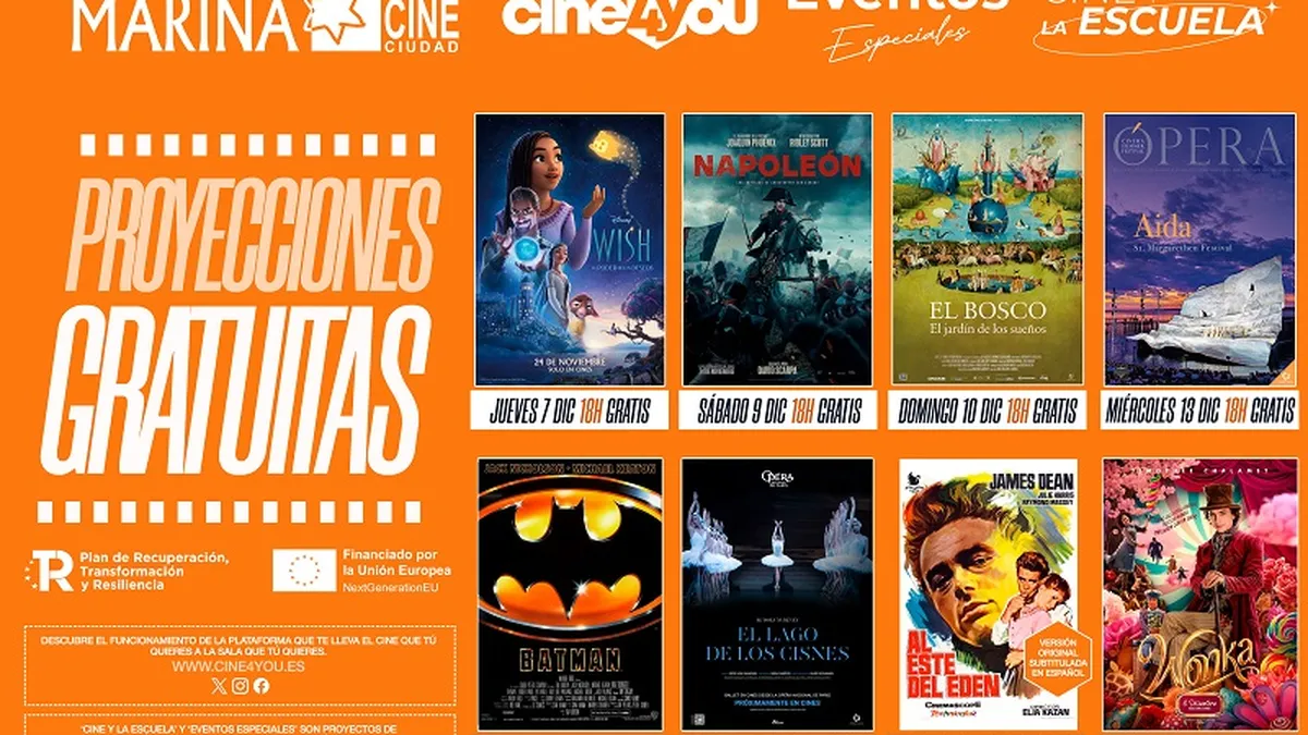 Los Cines Marina de Ceuta también emitirán producciones cinematográficas gratis hasta el 15 de diciembre. Unas películas de visualización sin costes que se enmarcan dentro del proyecto llamado "Proyecciones gratuitas" dentro del Plan de Recuperación, Transformación y Resiliencia, financiado por la Unión Europea. Unas jornadas que comenzaron el pasado jueves, 7 de diciembre, con la proyección de 'Wish', la nueva película de Disney.