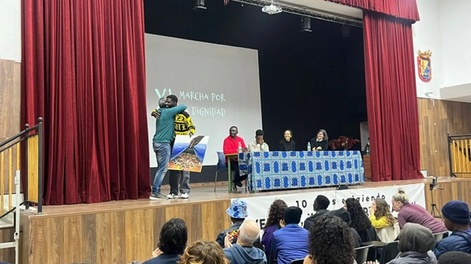 Y, aunque era sorpresa para todos, lo era de forma más especial para el que nombraba: Jesús Castro, “este cuadro viene de Jaén y volverá a él, porque se lo regalo a él”, refiriéndose al anteriormente mencionado. Aboubakar y Jesús, que sube al escenario a recoger el regalo más emotivo, se envuelven en un abrazo. El camerunés estuvo viviendo con Castro unos años y se ha ido involucrando más en el mundo de la lucha por la migración gracias a él, relataba.