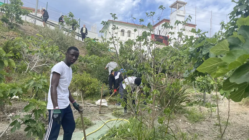 Mohamed ya había soltado el rastrillo cuando se acerca a hablar con nosotros. Es residente del CETI y participa en esta actividad por el simple hecho de convivir con “varias culturas y nacionalidades”. Y se lo están pasando “genial”. Plantar, cortar, pintar. El joven lleva un mes y veinte días en el Centro de Estancia Temporal y su castellano perfecto lo aprendió en Tetuán.