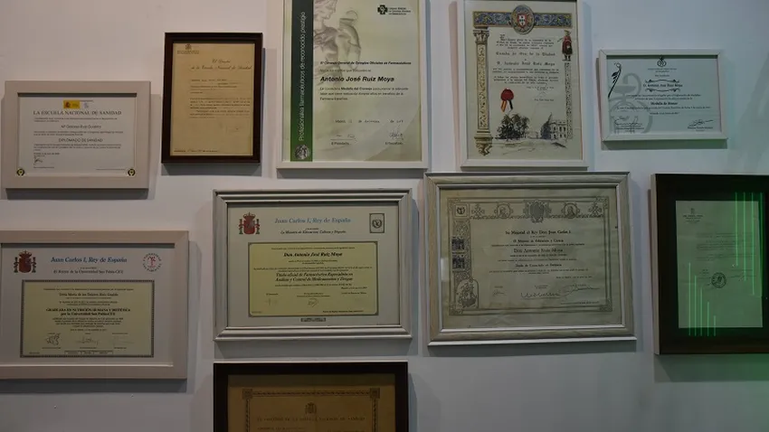 El despacho del longevo sanitario, ubicado al fondo en la Farmacia-Ortopedia ‘Ruiz’, atesora decenas de títulos enmarcados y dispuestos sobre sus paredes. Su licenciatura, el título oficial de farmacéutico especialista en Análisis y Control de Medicamentos y Droga, la Medalla de Honor del Consejo Andaluz, o la Medalla del Consejo General de Colegios Oficiales de Farmacéuticos de España. En la intimidad de su oficina, reconoce a El Pueblo de Ceuta que su “mayor orgullo” se encuentra también entre los cuadros. Señala uno de ellos, que le fuera entregado en 2016 por el presidente de Ceuta, Juan Vivas. “En el centro tengo el Escudo de Oro de la Ciudad”, explica.