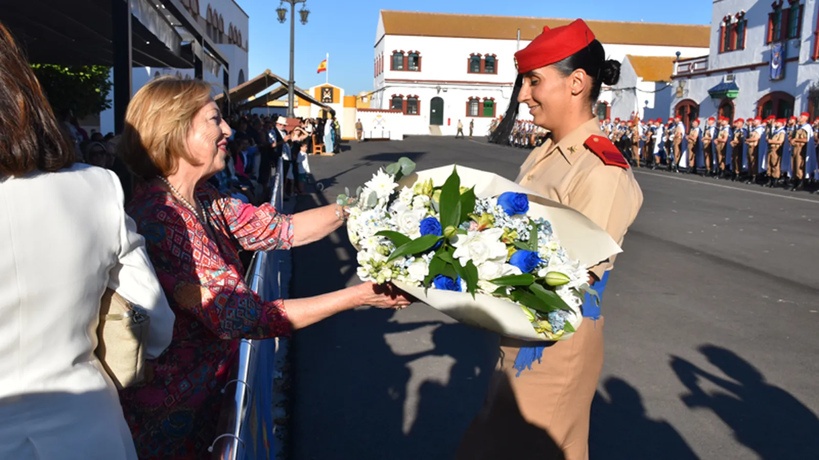 La ceremonia continuó con la entrega de un ramo de flores a María Dolores Puya Rivas, esposa del presidente de la Ciudad Autónoma de Ceuta y madrina de la bandera. Posteriormente, el presidente Vivas y el representante de la Delegación del Gobierno en Ceuta, Miguel Señor, hicieron su entrada en la plaza de armas, recibiendo los honores de rigor.